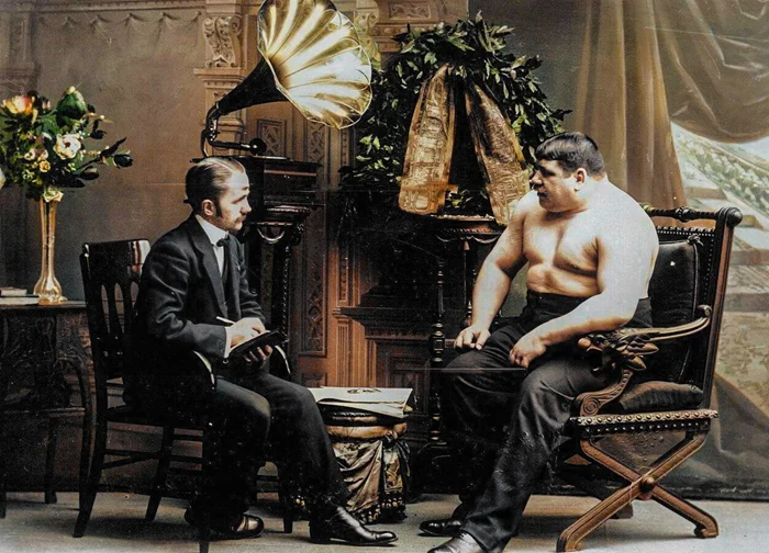 Александр Карлович Булла берет интервью у чемпиона мира по классической борьбе в тяжелом весе Николая Вахтурова, 1912 год.