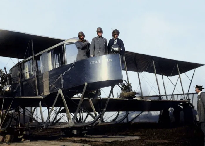 Инженер-конструктор Игорь Сикорский и его детище — многомоторный самолет «Русский витязь», 1913 год.
