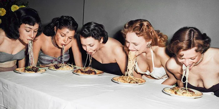 Девушки из бродвейского шоу соревнуются в конкурсе по поеданию спагетти без рук. США, 1948 год.