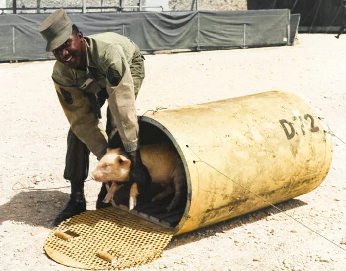 Натаниэль Морган извлекает поросёнка из контейнера, который находился в зоне воздействия ядерного взрыва на Невадском полигоне, 1957 год.