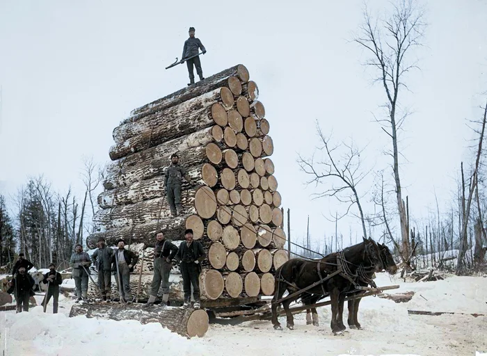 Транспортировка бревен на санях в Северном Мичигане. США, 1908 год.