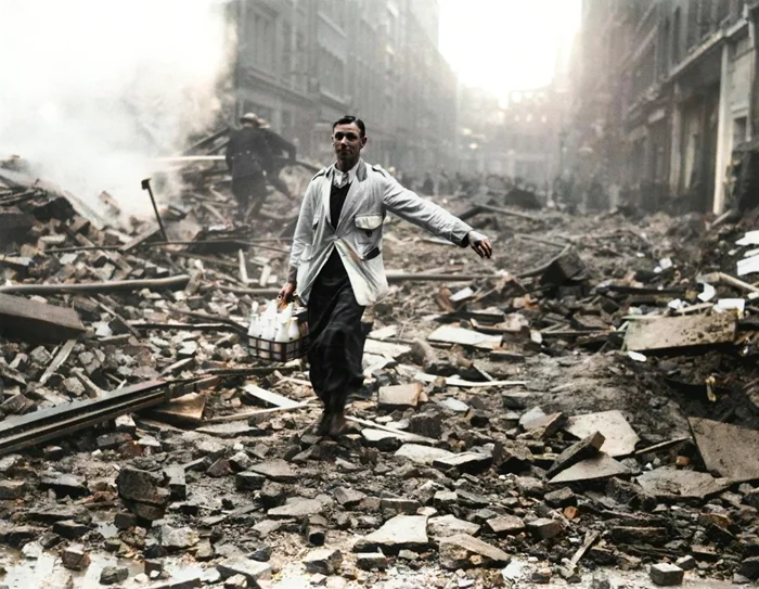 Британский молочник на улицах Лондона после немецкой бомбардировки, 1940 год.