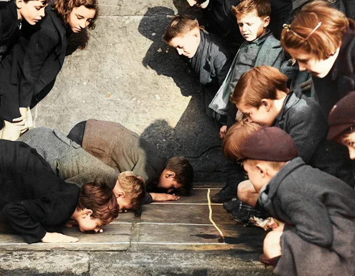 Группа детей играет в перекатывание арахиса носом на тротуаре. Лондон, 1938 год.