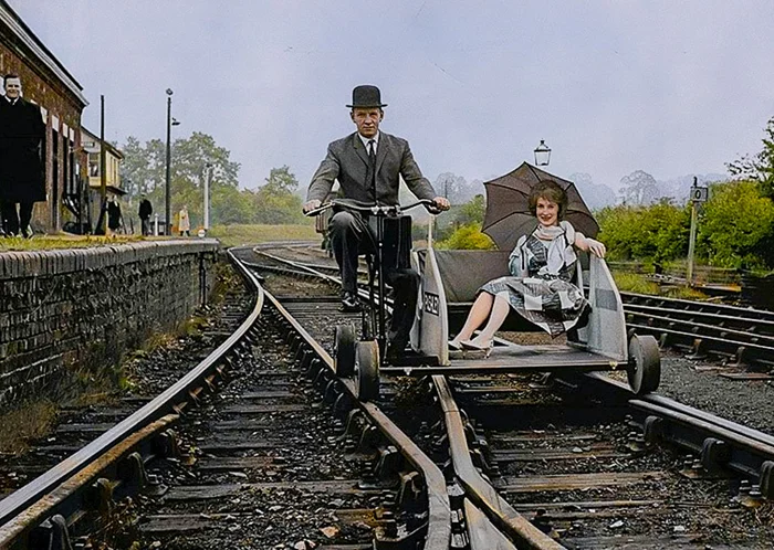 У железнодорожников такое транспортное средство называется дрезина, специальная самодвижущаяся тележка, которая передвигается по рельсам. Тут скрестили её с велосипедом.