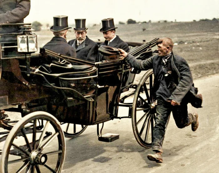 Нищий бежит за экипажем Георга V, короля Великобритании, 1920 год.