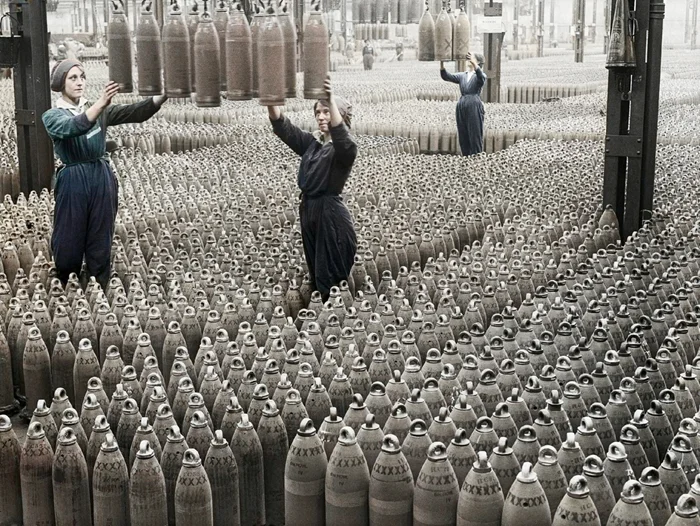 Женщины–работницы заполняют взрывчатыми веществами шестидюймовые снаряды для гаубиц, фабрика Shell Filling.