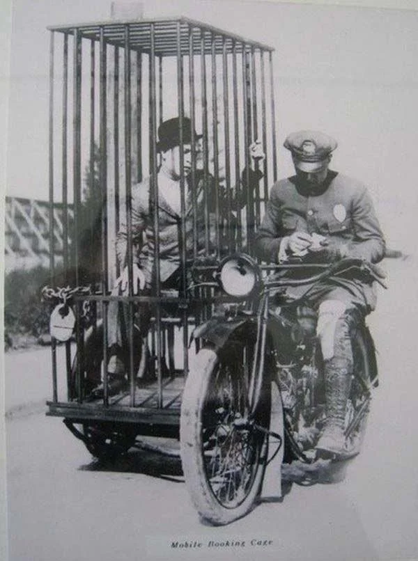 9. Полицейский на мотоцикле Harley-Davidson перевозит заключенного в клетке, 1921 год
