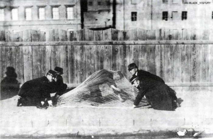 15. Медицинские работники психиатрической клиники отрабатывают методику поимки буйных безумцев, 1903 год