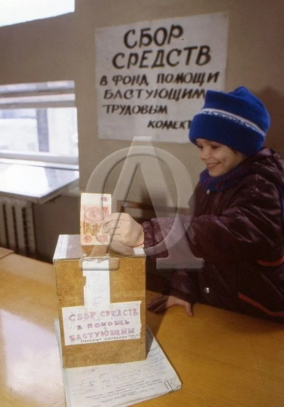 Сбор денежных сред в помощь бастующим шахтерам Кузбасса. Кемеровская область, 1991 год.