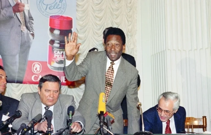 Министр спорта Бразилии Эдсон Арантис ду Насименту, более известный как футболист Пеле, во время презентации кофе "Пеле" в Москве, 1997 год.