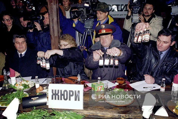 Жюри на первом чемпионате города Москвы по "спортивному выпиванию", организованном журналом "Столица" и радиостанцией "Серебряный дождь", 1997 год.
