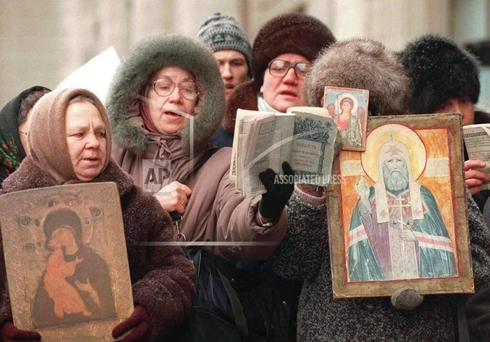 Пикет у Госдумы РФ против показа в России фильма Мартина Скорсезе «Последнее искушение Христа», январь 1998 год (сам фильм вышел на 10 лет раньше).