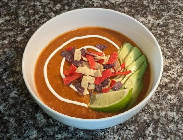 Суп из пюре фасоли с томатами, в который добавляется достаточно большое количество перца чили.