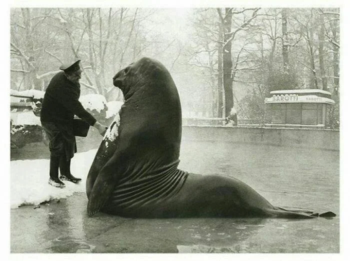 8. Роланд, морской слон весом 1800 кг, ждет, пока смотритель его помоет. Берлинский зоопарк, 1930 г.