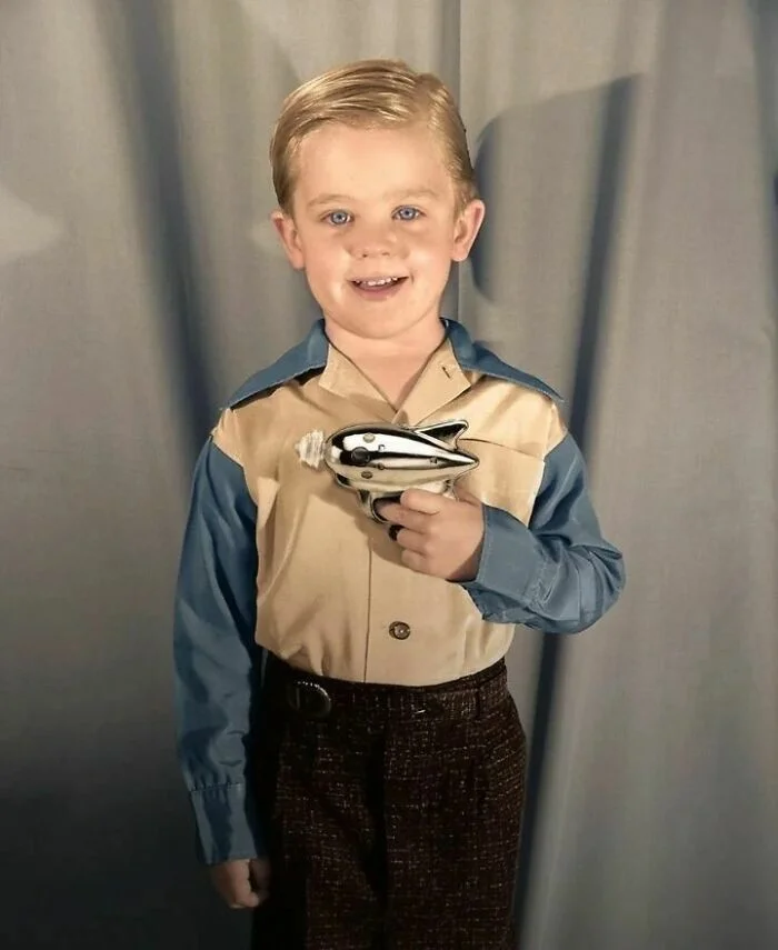 15. Мальчик демонстрирует игрушечный лучевой пистолет, 1950-е годы