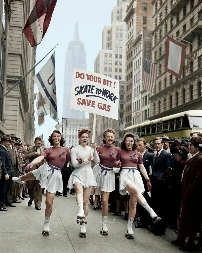 18. «Внеси свой вклад! Добирайся до работы на роликовых коньках!» Активистки, пропагандирующие нормирование газа во время Второй мировой войны. Нью-Йорк, 1940-е годы