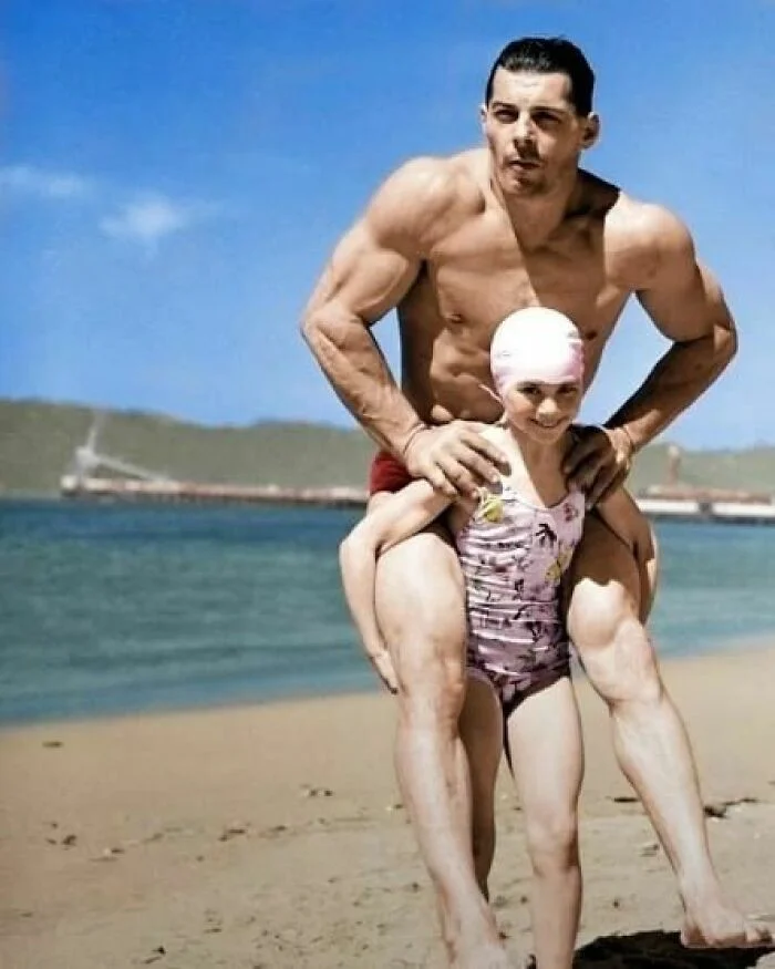 19. Необычная демонстрация силы: 8-летняя бодибилдерша Патриция О'Кифи несет на спине мужчину весом 90 кг, 1940 год