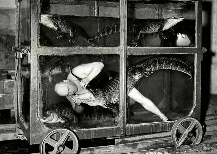 24. Цирковой артист в вагоне-аквариуме с крокодилами, Берлин, 1933 год