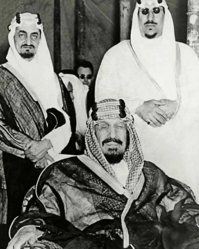26. Первый король Саудовской Аравии Ибн Сауд со своими сыновьями принцем Фейсалом (слева) и принцем Саудом (справа) в начале 1950-х годов