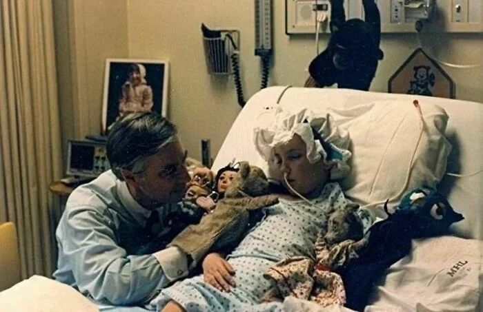 28. Кукольник и ведущий детской телепередачи Фред Роджерс выступает для 7-летней Бет Ашер (девочка с эпилепсией после операции на мозге), Балтимор, Мэриленд, 1987 год