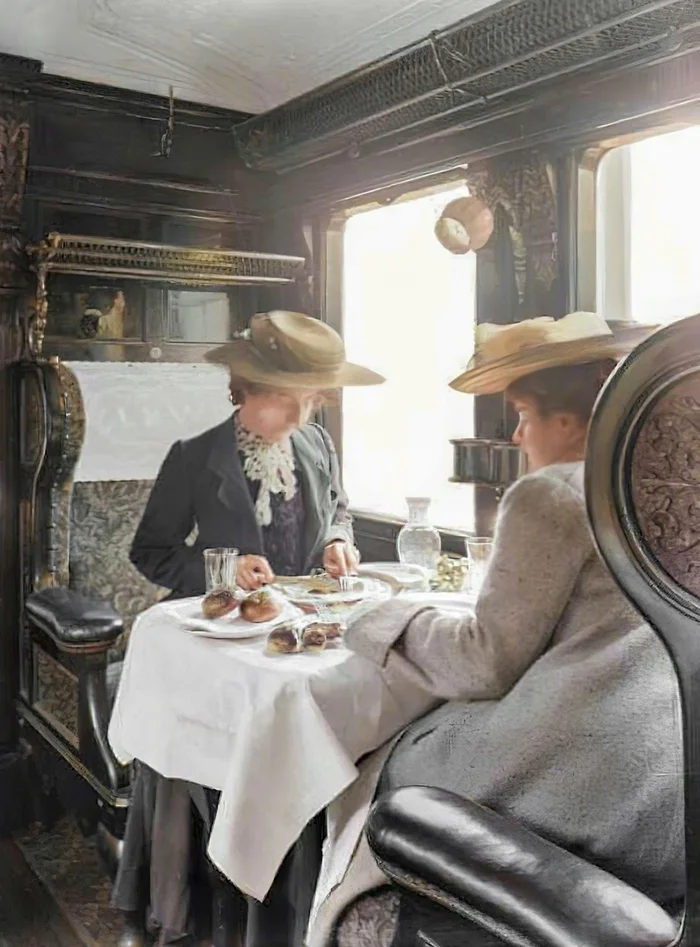 Пассажиры вагона-ресторана первого класса. Великобритания, 1905 год.