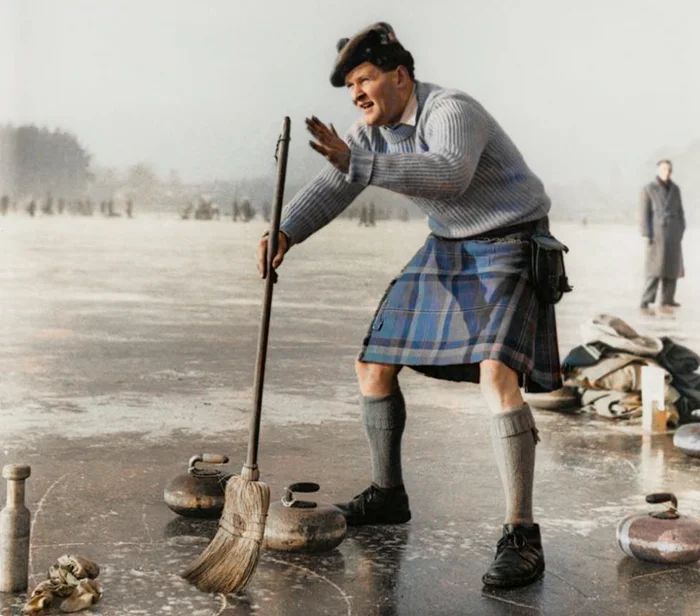 Ответственный момент матча в керлинг-клубе на озере Лох-Ливен. Шотландия, 1959 год.