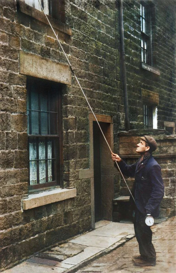 Человек-будильник использовал разнообразные методы для пробуждения своих клиентов. Самым распространенным инструментом была длинная деревянная палка, которой человек-будильник стучал по окнам верхних этажей.