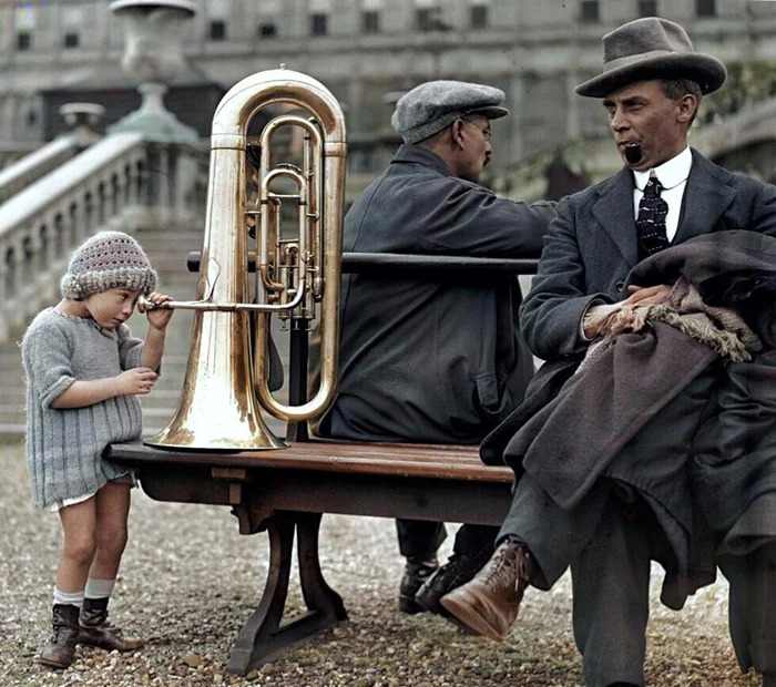 Девочка с тубой на национальном фестивале оркестров в Лондоне, 1923 год.