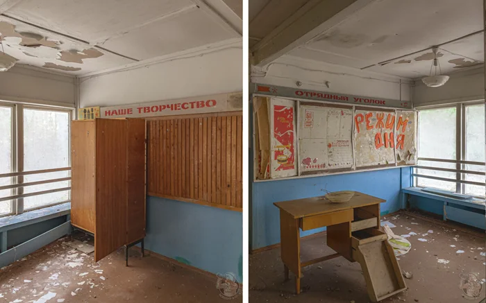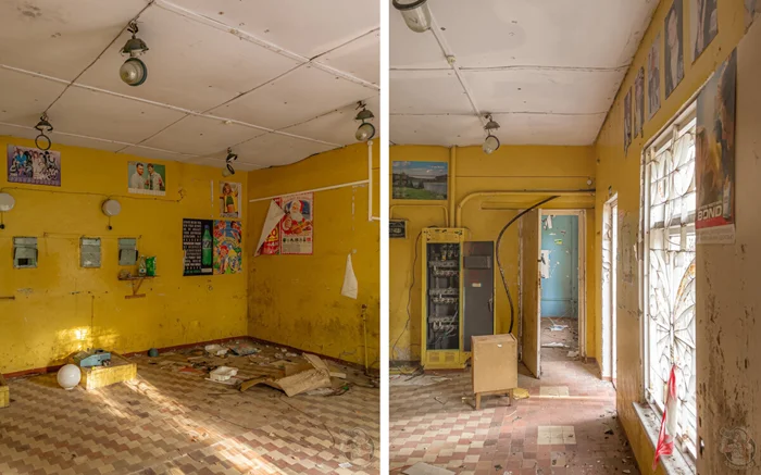 Следующим зданием на нашем пути была столовая. Её состояние также не оставляло сомнений в том, что она заброшена. Стёкла разбиты, крыша обвалилась, а двери открыты нараспашку.