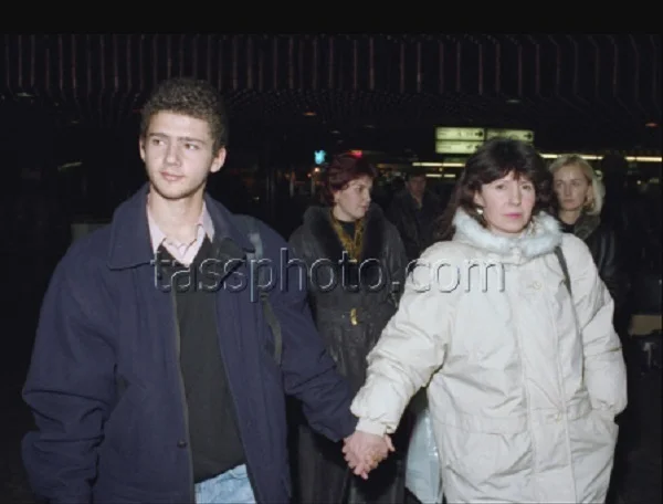 Возвращение российского глухонемого подростка Романа Венкова в Россию, 16 декабря 1996 года. На фото Роман Венков со своей мамой Ольгой Михайловной и его двоюродной сестрой Еленой Ростопшей в аэропорту Шереметьево.