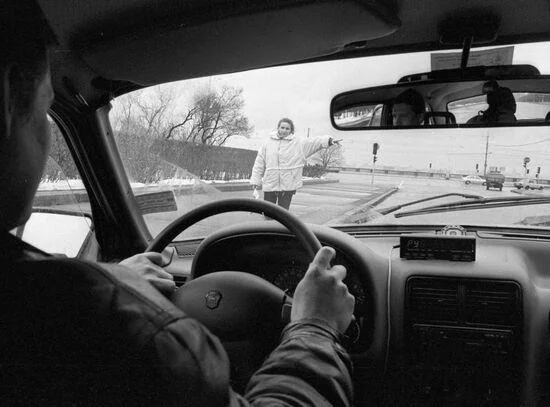 Таксист направляется к голосующей на дороге девушке, 1998 год.