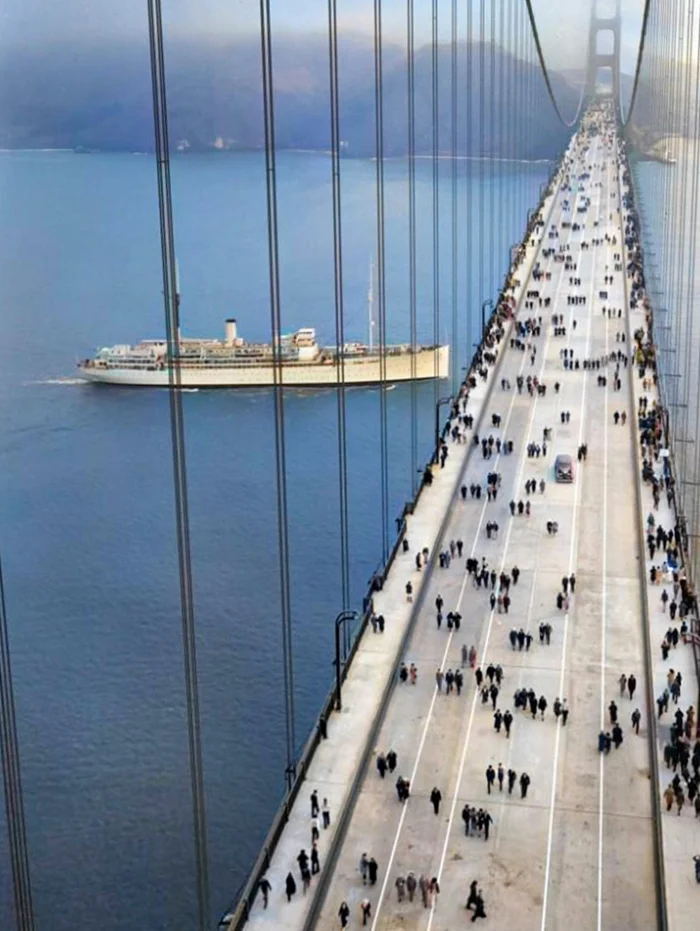 Первый день уже открытого моста "Золотые ворота", США, 1937 год.