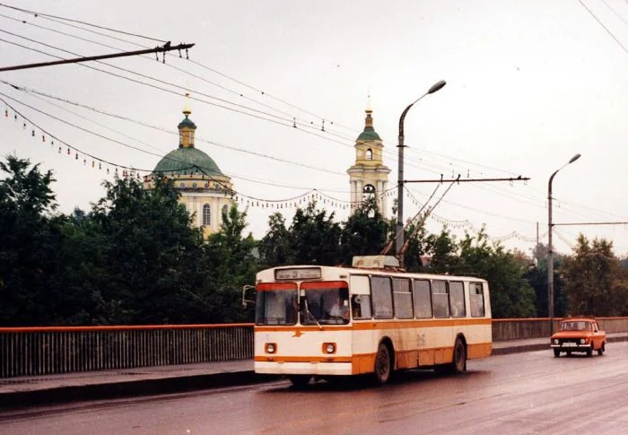 Троллейбус на Тургеневском мосту. Орёл, 1991 год.