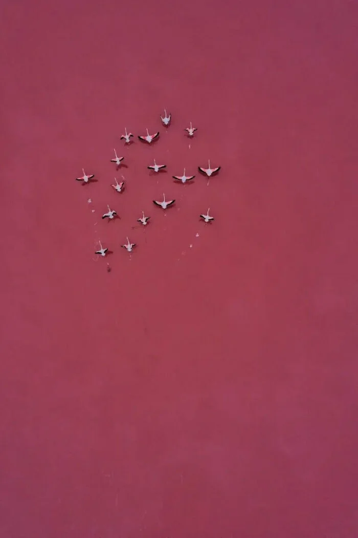 Большие фламинго вылетают из дикой лагуны острова Сен-Мартен, расположенного на юге Франции. Окрас больших фламинго меняется в зависимости от времени года. Почти белое летом, их оперение становится ярко-розовым в зимнее время. Именно в это время они участвуют в ухаживаниях, чтобы привлечь своего будущего партнера. Такой цвет обусловлен бета-каротином, содержащимся в водорослях, личинках мухи-береговушки и планктоне, которыми они питаются в этой болотной среде. Розовый цвет воды обусловлен водорослями dunaliella salina, также богатыми бета-каротином.