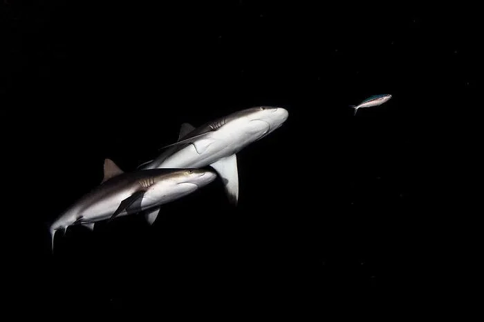 «На этой фотографии изображена пара серых рифовых акул, преследующих свою добычу во время ночной охоты. Фотография была сделана в Южной Факараве, Французская Полинезия, очень удаленном месте, где акулы водятся в изобилии. Акулы агрессивны, когда охотятся ночью, и Факарава — одно из редких мест, где ночной дайвинг не запрещен из-за риска. Добыча пряталась среди трещин и расщелин в кораллах. Затем последовала скоростная погоня в кромешной тьме ночи. Я изо всех сил отталкивался плавниками и следил за погоней, яростно фотографируя происходящее, и мне посчастливилось сделать этот снимок».
