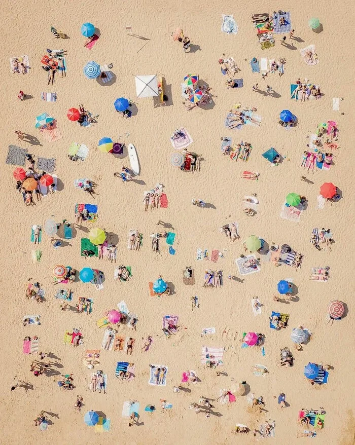 «Любители солнца приносят на берега Кашкайша (Португалия) свои самые яркие полотенца, купальники и зонтики, создавая при взгляде сверху замечательные яркие обои, переливающиеся жизнью. На пляже жизнь лучше!»