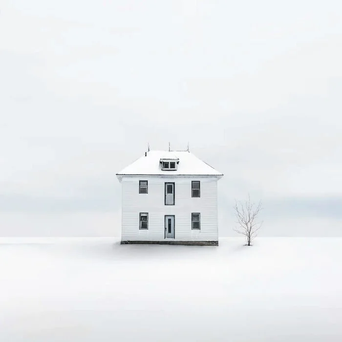 «Я проезжала мимо этого дома на следующий день после канадской зимней метели. Девственный снег перед домом и на крыше создал условия для идеального снимка в стиле минимализм. Уникальность этой архитектуры заключается в отсутствии ступеней и балкона у двух дверей».