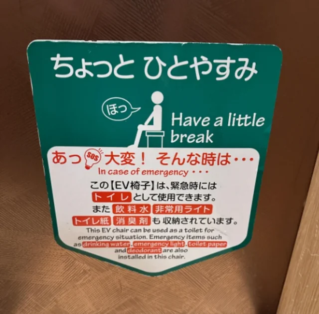 В лифтах Японии есть аварийные стулья-унитазы на случай, если вы застрянете. А в отдельном отсеке там можно найти еще и питьевую воду, аварийный фонарь, туалетную бумагу и дезодорант