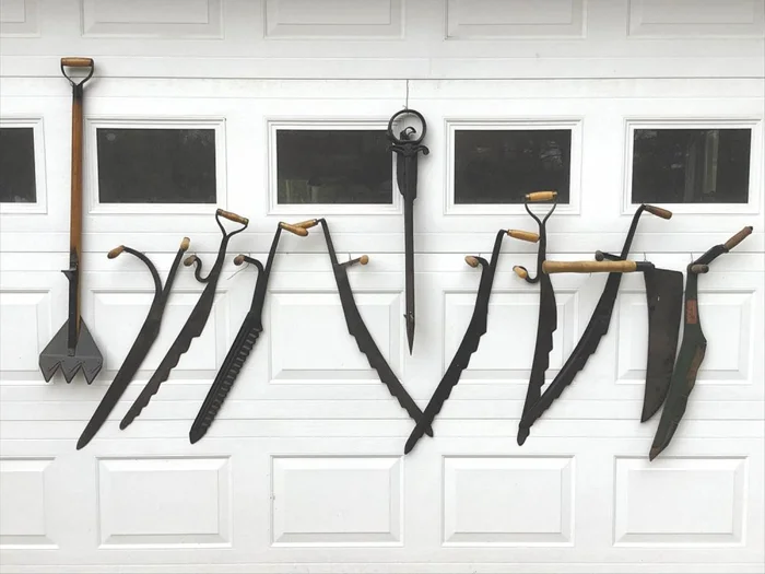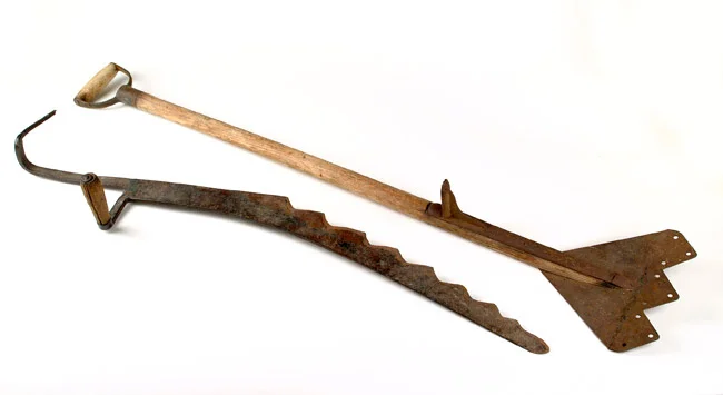 Это старое приспособление для отрезания нужного количества сена и дальнейшего его переноса куда надо. Вообще, их несколько разных, одно похоже на длинный нож (или на широкий нож), второе - вот это. Логика работы - отделил часть сена, положил куда надо.
