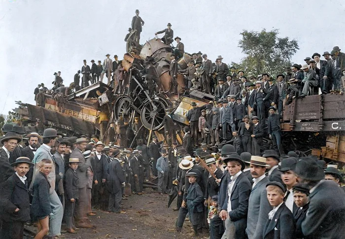 Столкновение двух локомотивов в штате Техас, устроил некий гражданин по фамилии Crush. Посмотреть на это собралось 40 тыс. зрителей. В итоге 2 человека погибли, фотографу повредило глаз болтом.