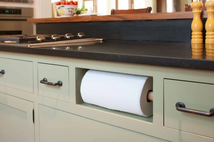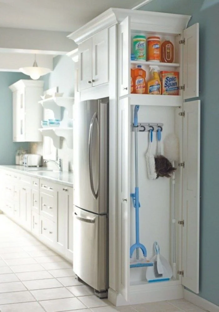 Маленький хозяйственный шкаф на кухне прекрасно подойдёт для хранения чистящих средств и инвентаря