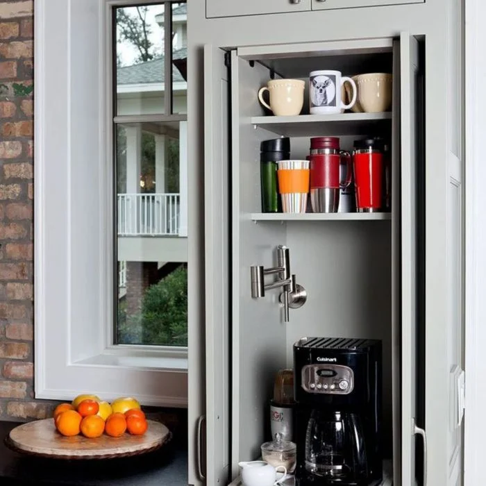 Раздвижные дверцы удобно скрывают кофемашину и другие принадлежности