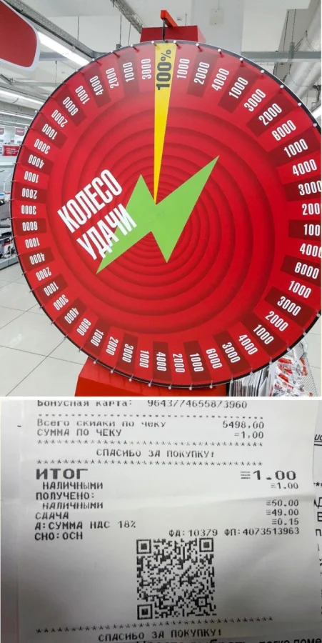 13. Покупал микроволновку, и продавец посоветовал модель по скидке. Во время оформления документов мне предложили крутануть колесо фортуны — и я выиграл 100% скидку! В итоге микроволновка обошлась в один рубль.