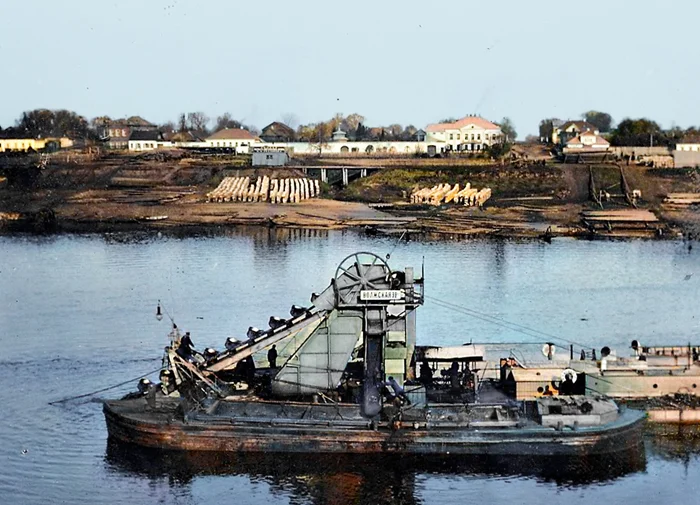 Судоходство на Волге сталкивается с разными проблемами. То из-за неосторожного обращения с огнём сгорит речное судно, то пароход пробьёт днище о валун, лежащий на дне реки, и затонет. Иной раз просто сядет на мель. В итоге речники добились от правительства средств на разведку и ликвидацию опасных мест на реке. Валуны доставались со дна специальными бригадами, а углубление фарватера происходило с помощью земснарядов. На снимке представлен пример судна технического флота "Волжская 38", которое производит выемку ила со дна реки Волги.