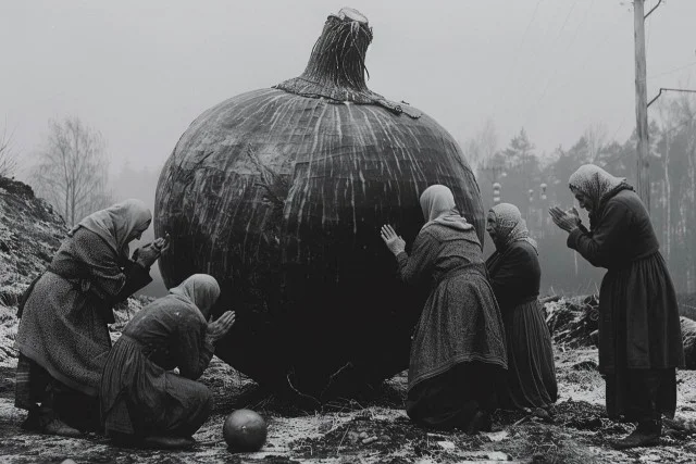 Жители, уставшие от нищеты и безысходности, с радостью принимают новое божество. Они строят вокруг репки алтарь, приносят ей жертвы, поклоняются ей день и ночь.