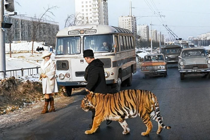 По улицам тигра водили, как видно напоказ... Фотография была сделана в марте 1976 года, когда Вальтер Запашный с женой и тигром были в Уфе на гастролях, выступали в местном цирке.