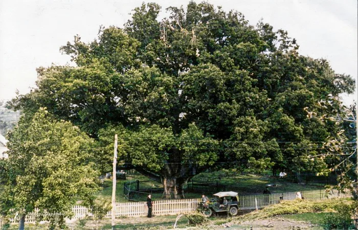 На фотографии запечатлен 700-летний гигант во всей красе. В 1990-х дуб почти засох, осталась одна живая ветвь.