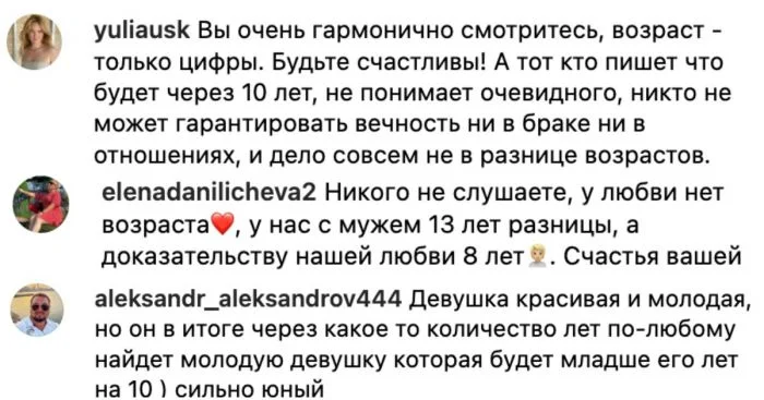На фотографиях они всегда счастливы: обнимаются, целуются, но комментарии порой бывают жестокими. Многие пишут, что они больше похожи на «мамочку и сына», хотя разница всего 12 лет. Артуру сейчас 26, а Гульназ — 37.