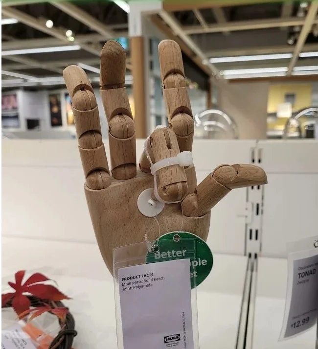 18. В магазине IKEA: средний палец закрепили пластиковым хомутом, чтобы посетители не баловались