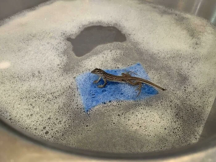 2. "Зашел на кухню и увидел в раковине ящерицу, которая плавала на губке как на плоту"